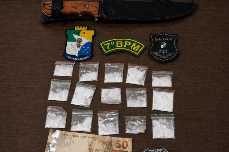 Em decorrência da suspeição, e ao notar que um deles estava com um volume na cintura, os policiais deram voz de parada e prosseguiram com as buscas pessoais. Com eles, os PMs encontraram uma arma branca, cocaína e R$ 50,00 reais em espécie.