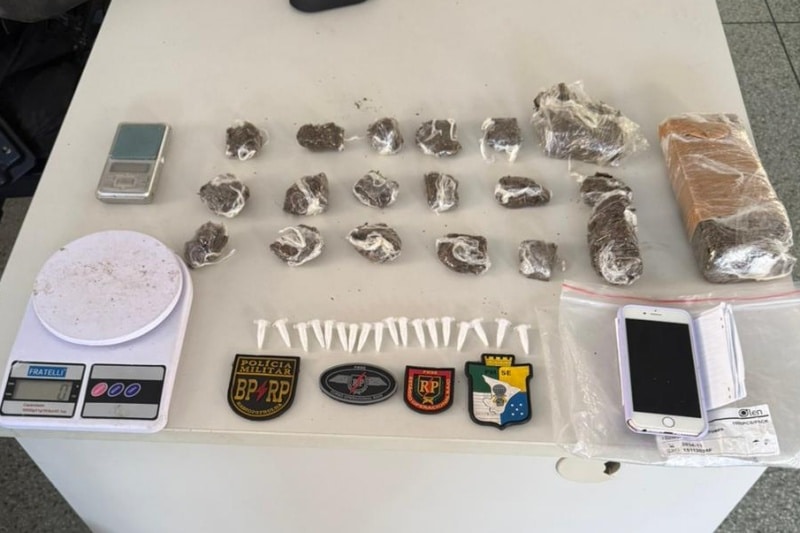 Os ocupantes deixaram a porta entreaberta, facilitando a visualização de entorpecentes na parte interior. Com base no flagrante, os PMs adentraram ao domicílio e encontraram maconha, cocaína, duas balanças de precisão e um carnê nominado.