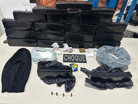 No local, ninguém foi encontrado, mas um forte odor de entorpecentes chamou a atenção dos agentes. Dentro do imóvel, foram apreendidos 18 tabletes de substância análoga à maconha, pesando aproximadamente 10,5 kg, além de 670 g de cocaína, quatro munições calibre 9 mm e uma touca tipo balaclava.