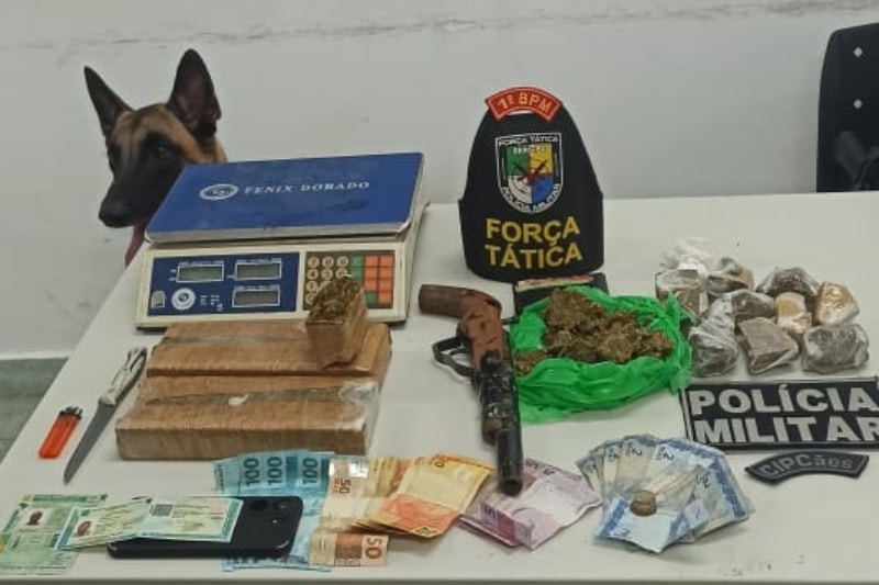 De imediato, os policiais do 1º BPM solicitaram o auxílio da Companhia Independente de Policiamento com Cães (Cipcães) e foram até o local para fazer a varredura. Como resultado das buscas, os cães farejadores localizaram cerca de 1Kg de maconha fracionada, 13g de cocaína, uma balança de precisão e uma arma de fogo de fabricação caseira.