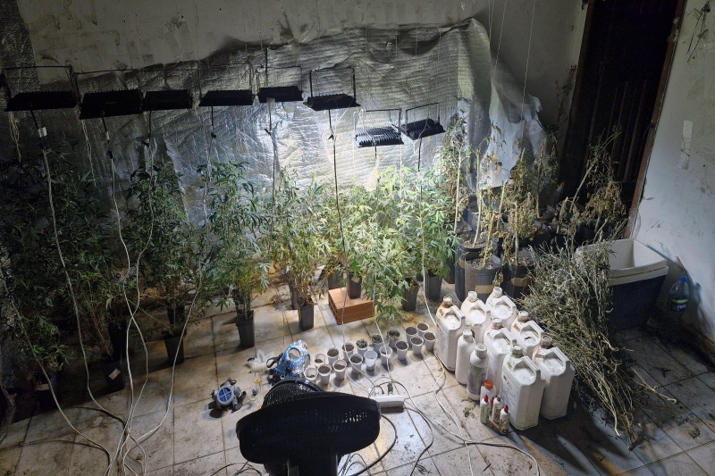 No interior do imóvel, foi localizado um laboratório improvisado com painéis de LED, ventiladores, fertilizantes, máscaras de respiração, luvas e uma estufa ativa com sistema de iluminação e ventilação.