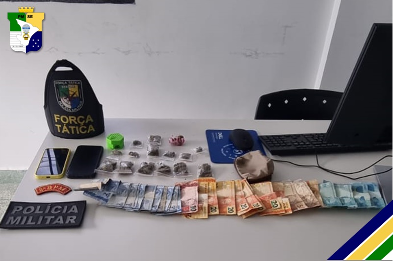 Durante as buscas pessoal e perimetral, os PMs encontraram maconha fracionada e embalada, além de dinheiro em espécie.