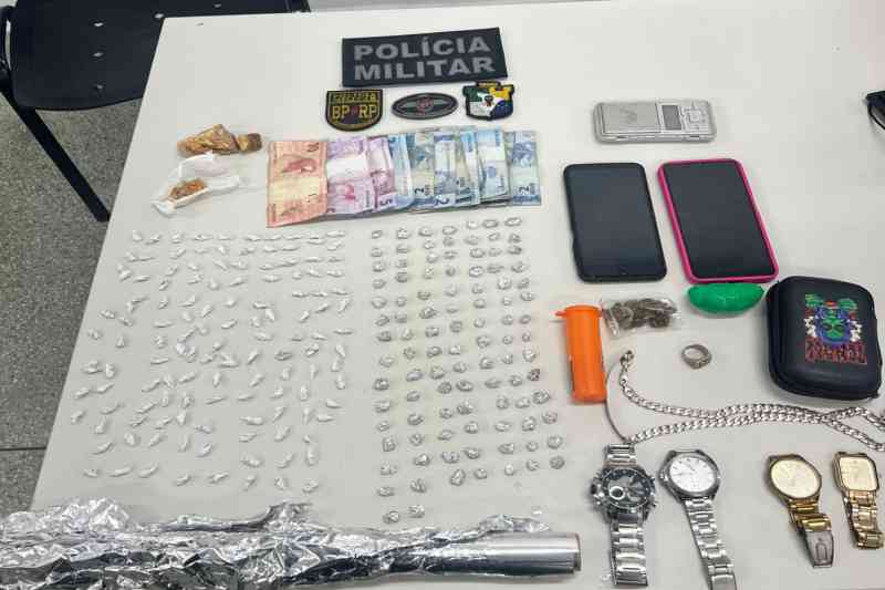 Ao todo, foram apreendidos 10g de substância análoga à maconha, 84g de substância análoga ao crack, R$ 48,00 em espécie, uma balança de precisão e dois aparelhos celulares,