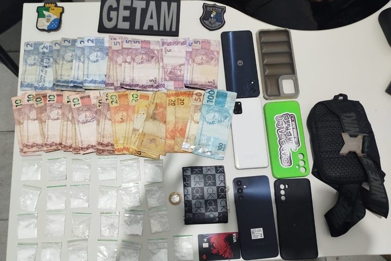 Em virtude da atitude suspeita, os agentes decidiram pela abordagem. Durante o procedimento, os policiais encontraram 25 papelotes de cocaína escondidos nos bolsos e calçados dos suspeitos. Também foram apreendidos R$ 473,00 em cédulas de vários valores.
