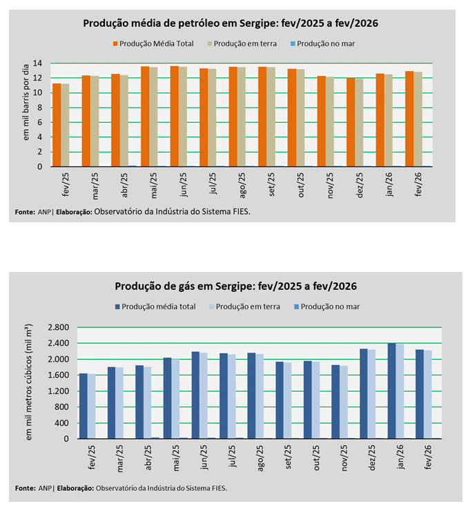 Análise realizada pelo Análise realizada pelo Observatório da Indústria do Sistema FIES, com base nos dados da Agência Nacional do Petróleo, Gás Natural e Biocombustíveis (ANP), revelou que a produção de petróleo no estado, no mês de fevereiro, alcançou, em média, 12,9 mil barris por dia (bpd), registrando um acréscimo de 2,7% em relação à produção média do mês anterior (janeiro/2026). No comparativo com fevereiro de 2025, verificou-se crescimento de 15,0%.