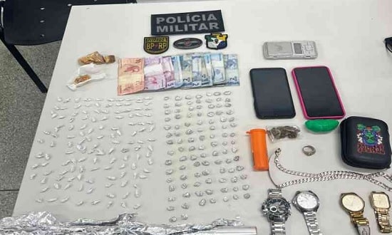 Ao todo, foram apreendidos 10g de substância análoga à maconha, 84g de substância análoga ao crack, R$ 48,00 em espécie, uma balança de precisão e dois aparelhos celulares,