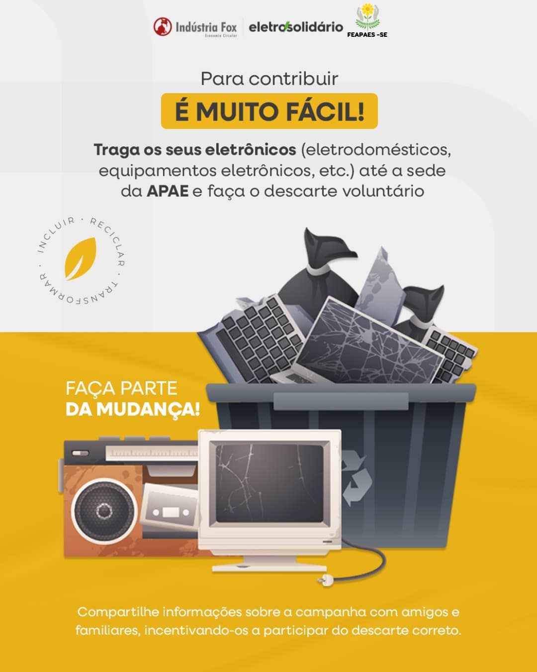 A Federação das Apaes do Estado de Sergipe (Feapaes-SE), em parceria com a Federação Nacional das Apaes (Apae Brasil) e o projeto EletroSolidário, da Indústria Fox, lança oficialmente a Mega Campanha APAExonados pelo Planeta no estado. A mobilização, de alcance nacional, une sustentabilidade ambiental e inclusão social, por meio da coleta de eletrodomésticos e eletroeletrônicos fora de uso.