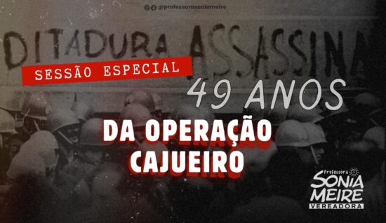 Na próxima quinta-feira, dia 20, às 14h, será realizada no plenário da Câmara Municipal de Aracaju (CMA), a sessão especial ’49 Anos da Operação Cajueiro’, de autoria da vereadora Sonia Meire (PSOL). E a parlamentar convida toda a sociedade aracajuana para participar presencialmente ou acompanhando pela TV Câmara, deste momento de debate sobre um período sombrio da história brasileira, destacando que nem essa época nem as milhares de pessoas que lutaram durante podem ser esquecidas.