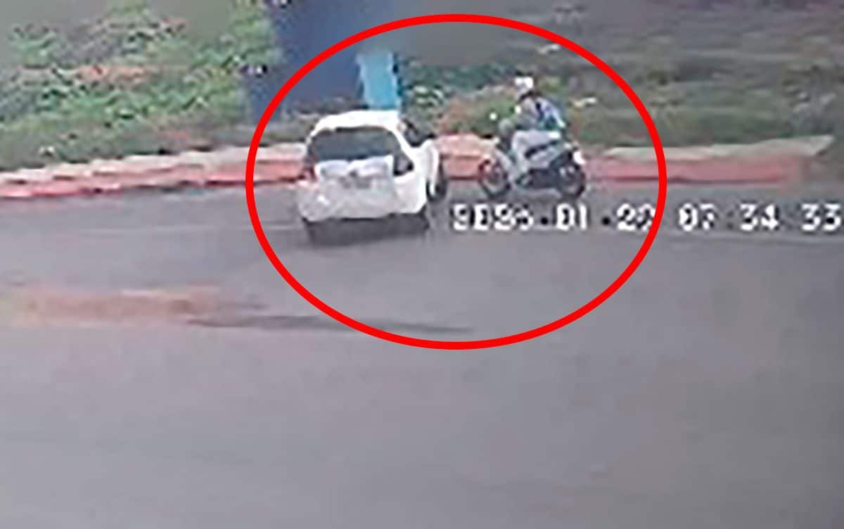 Imagens de câmeras de monitoramento mostram o momento da colisão. Com o impacto, uma pessoa ficou ferida. Por pouco, outro motociclista que seguia logo atrás não acabou colidindo no mesmo veículo.