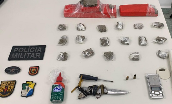 Na residência, os policiais abordaram o suspeito, identificado pelo vulgo “Pitchu”, que estava com uma sacola contendo 17 porções de maconha já embaladas para a venda. Durante as buscas, foram encontrados ainda dois tabletes de maconha prensada, uma balança de precisão, papel filme, um canivete, uma munição intacta de calibre .40, uma deflagrada de calibre .38 e uma arma artesanal com capacidade de disparo.