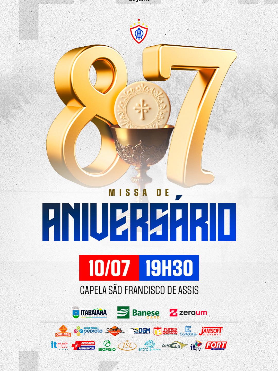 A tradicional missa em celebração aos 87 anos da Associação Olímpica de Itabaiana será realizada nesta quinta-feira, 10 de julho, às 19h30, na Capela São Francisco.