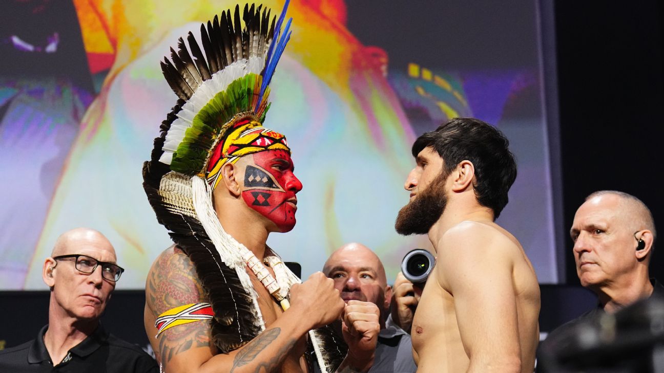 Com o semblante fechado, Alex Pereira ficou frente a frente com Ankalaev para protagonizar uma encarada de tirar o fôlego. Confiante, o wrestler russo voltou a provocar seu adversário.
